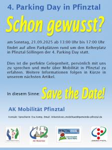 Mobilitätswende ist mehr als nur ein Elektroauto zu fahren. In unserer Arbeitsgruppe fragen wir uns, wie Mobilität in Pfinztal für alle attraktiver und vor allem, wie sie nachhaltiger werden kann. Mit unserem Gemeindeentwicklungskonzept Pfinztal 2035 – Zukunft gemeinsam gestalten „LebensQualität durch Nähe“ haben wir bereits die Grundlagen „Pfinztal Macht Mobil“ geschaffen; nun müssen wir mehr tun, um nachhaltige Mobilität für alle zu erreichen. Internationale Aktionstage dienen dazu, die Öffentlichkeit über wichtige Themen aufzuklären. Im Falle des Internationalen Parking Days geht es darum, das Bewusstsein für die Nutzung von Flächen zu schärfen, die bisher ausschließlich für Autos und den Individualverkehr vorgesehen sind. Der Parking Day ist eine unterhaltsame Veranstaltung für alle: Kinder und Erwachsene, Jung und Alt, Familien und Singles. An diesem Tag im September verwandeln wir den Kelterplatz in einen Ort, an dem Menschen Spaß haben, spielen, Ideen austauschen, andere Menschen treffen und den Raum nutzen können, der sonst von Autos blockiert ist.