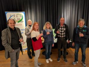 Am vergangenen Mittwochabend wurden die Preise an die glücklichen Gewinner überreicht. Leider konnten sich nicht alle Gewinnerinnen freinehmen. Es herrschte eine angenehme Atmosphäre beim Empfang mit Kaffee, Sekt und Brezeln. Bürgermeistervertreter Frank Hörter dankte dem AK Mobilitätsteam für sein außerordentliches Engagement. Er überreichte die Siegerurkunden, auf die sie zu Recht stolz sein können, denn ihre Teilnahme an dieser Aktion ist auch ein Vorbild für den Klimaschutz. Von Steffen Hauswirth, Vorsitzender des Gewerbevereins, erhielten sie die Pfinztal-Gutscheine. Er wies darauf hin, dass, wer mit dem Rad oder zu Fuß in Pfinztal einkaufen geht, die Pfinztaler Gewerbetreibenden unterstützt und dazu beiträgt, das Angebot vor Ort zu erhalten. Von Eva Kemp, der Vorsitzenden des AK Mobilität, erhielten die Preisträgerinnen eine Netz-Tageskarte des KVV und Andenken an die Europäische Mobilitätswoche 2025.