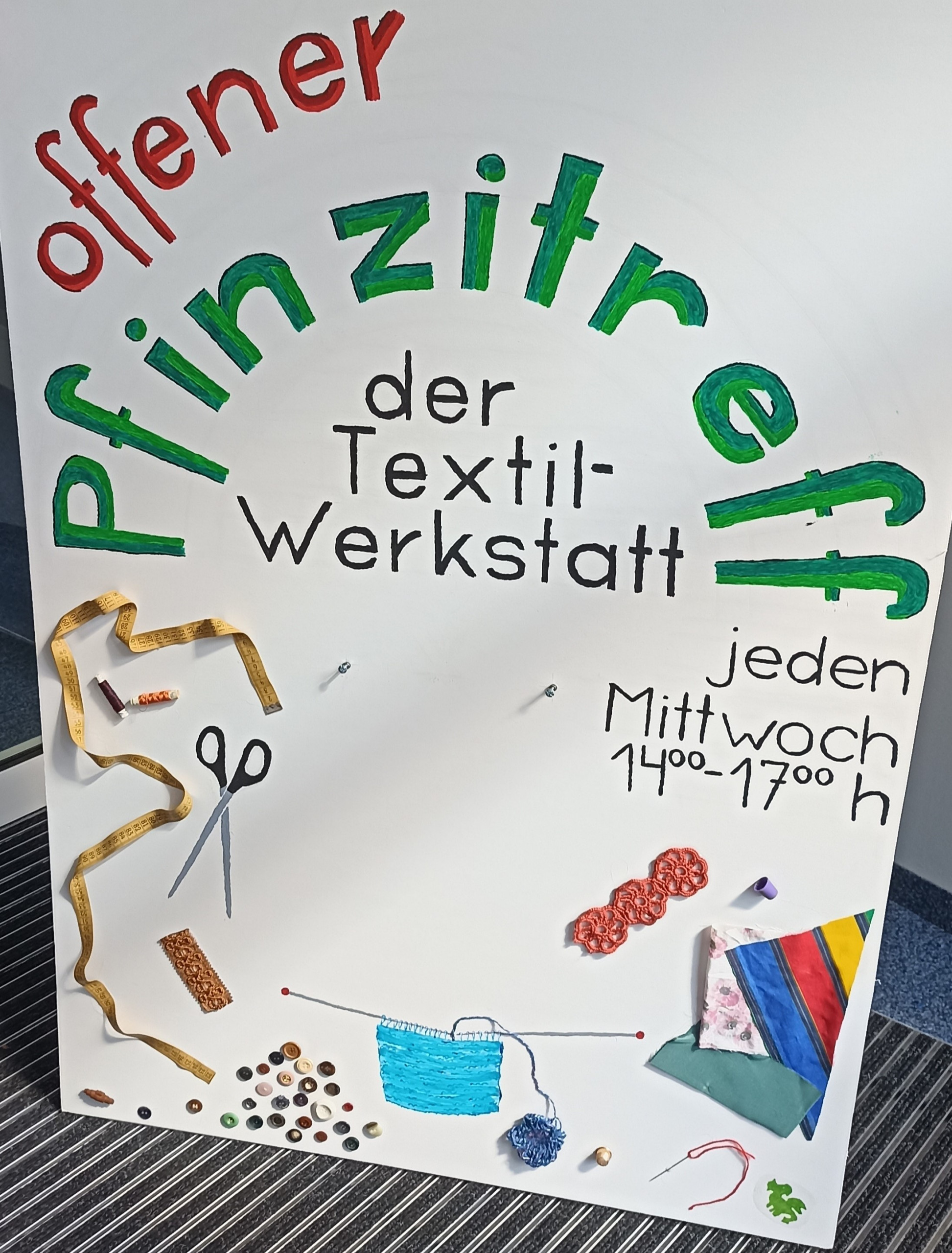 Große Auswahl an Materialien und Zubehör (Wolle, Stoffe, Häkel- und Stricknadeln, Kurzwaren etc.) sind vorhanden, können abgegeben und verarbeitet werden.